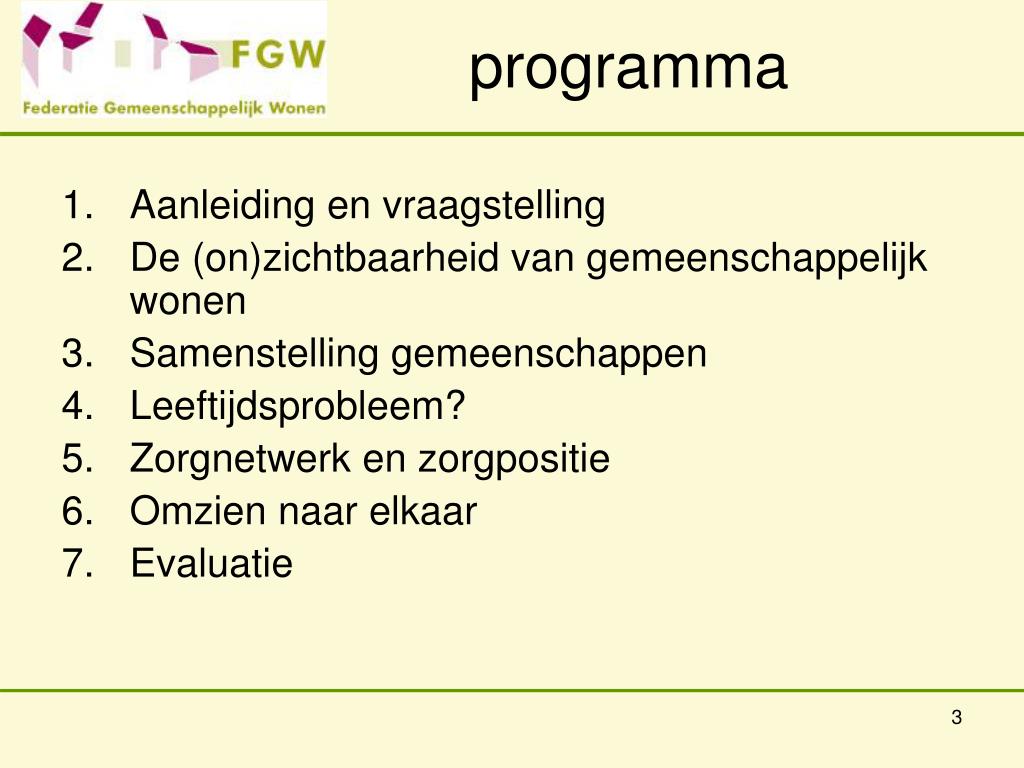 programma • Aanleiding en vraagstelling • De (on)zichtbaarheid van gemeenschappelijk wonen • Samenstelling gemeenschappen • Leeftijdsprobleem? • Zorgnetwerk en zorgpositie • Omzien naar elkaar • Evaluatie