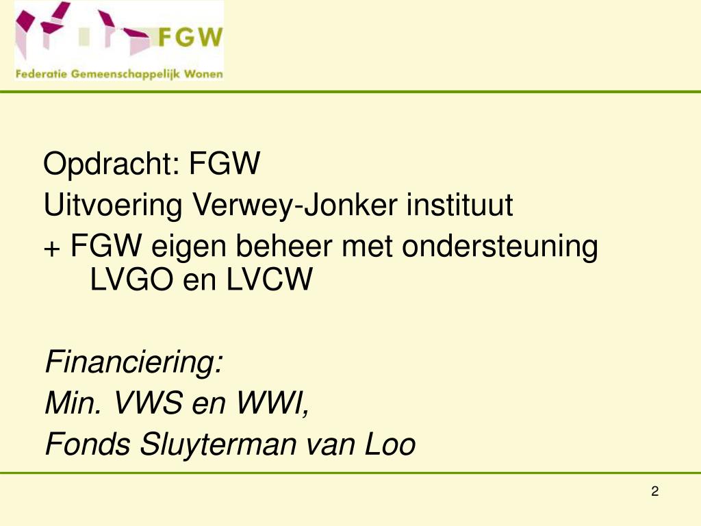 Opdracht: FGW Uitvoering Verwey-Jonker instituut + FGW eigen beheer met ondersteuning LVGO en LVCW Financiering: Min. VWS en WWI, Fonds Sluyterman van Loo