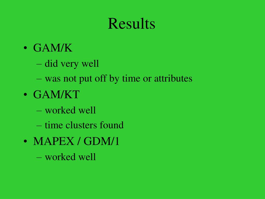 Results • GAM/K • did very well • was not put off by time or attributes • GAM/KT • worked well • time clusters found • MAPEX / GDM/1 • worked well