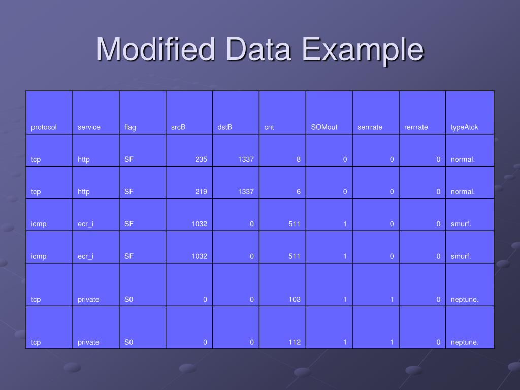 Data Sets • UCI Knowledge Discovery in Databases (KDD) • KDD CUP 1999 for Intrusion Detection Database