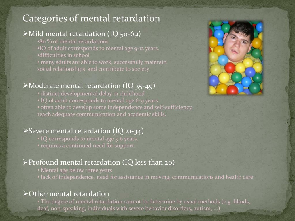 Categoriesofmentalretardation • Mild mental retardation (IQ 50-69) • 80 % of mental retardations • IQ of adultcorresponds to mental age 9-12 years. • difficulties in school • many adults are able to work, successfully maintain • social relationships and contribute to society • Moderate mental retardation (IQ 35-49) • distinct developmental delay in childhood • IQ of adultcorresponds to mental age 6-9 years. • often able to develop some independence and self-sufficiency, • reach adequate communication and academic skills. • Severe mental retardation (IQ 21-34) • IQ corresponds to mental age 3-6 years. • requires a continued need for support. • Profound mental retardation (IQ less than 20) • Mental age below three years • lack of independence, need for assistance in moving, communications and health care • Other mental retardation • The degree of mental retardation cannot be determine by usual methods (e.g. blinds, • deaf,non-speaking,individuals with severe behavior disorders, autism, ...)