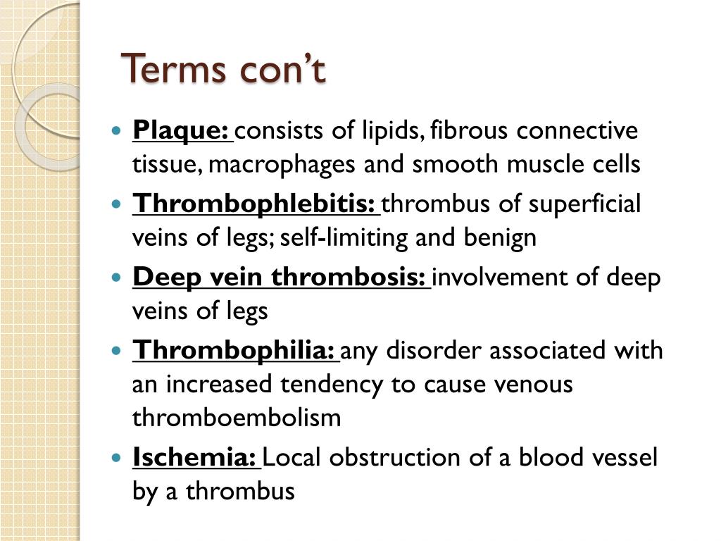 Terms con’t • Plaque: consists of lipids, fibrous connective tissue, macrophages and smooth muscle cells • Thrombophlebitis: thrombus of superficial veins of legs; self-limiting and benign • Deep vein thrombosis: involvement of deep veins of legs • Thrombophilia: any disorder associated with an increased tendency to cause venous thromboembolism • Ischemia: Local obstruction of a blood vessel by a thrombus