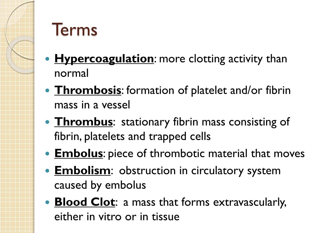 Terms • Hypercoagulation: more clotting activity than normal • Thrombosis: formation of platelet and/or fibrin mass in a vessel • Thrombus: stationary fibrin mass consisting of fibrin, platelets and trapped cells • Embolus: piece of thrombotic material that moves • Embolism: obstruction in circulatory system caused by embolus • Blood Clot: a mass that forms extravascularly, either in vitro or in tissue