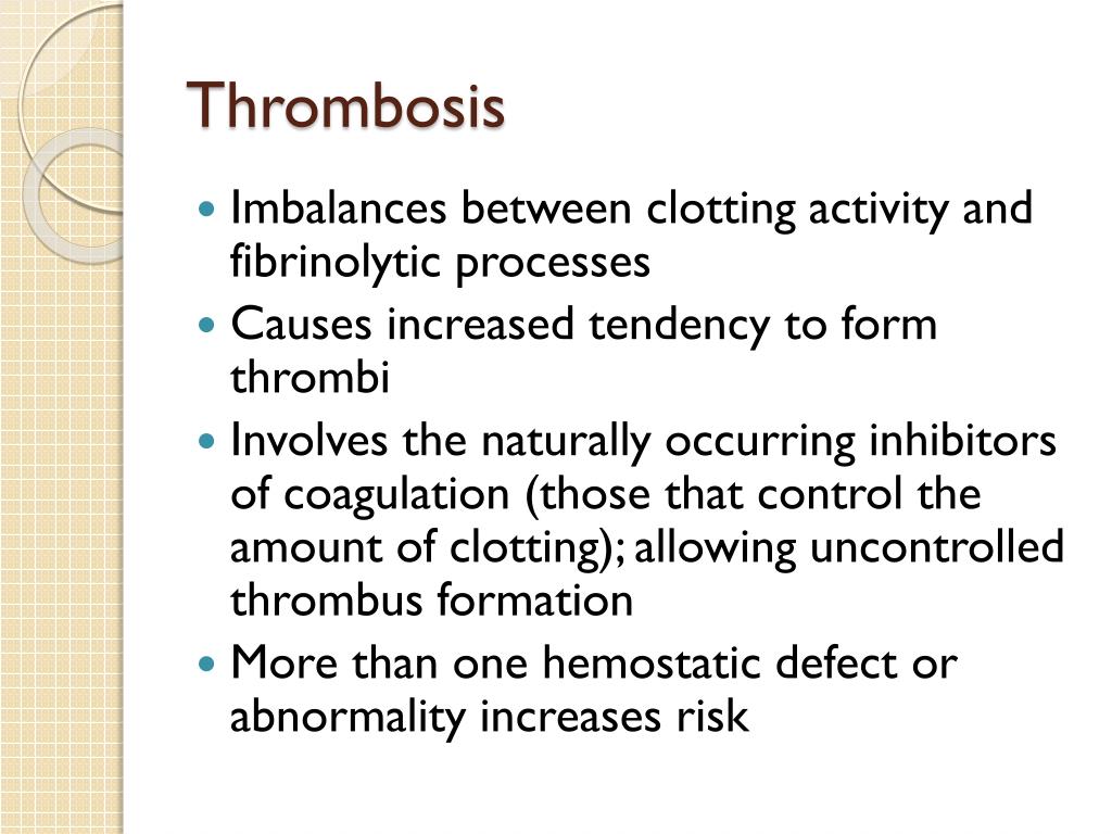 Thrombosis • Imbalances between clotting activity and fibrinolytic processes • Causes increased tendency to form thrombi • Involves the naturally occurring inhibitors of coagulation (those that control the amount of clotting); allowing uncontrolled thrombus formation • More than one hemostatic defect or abnormality increases risk