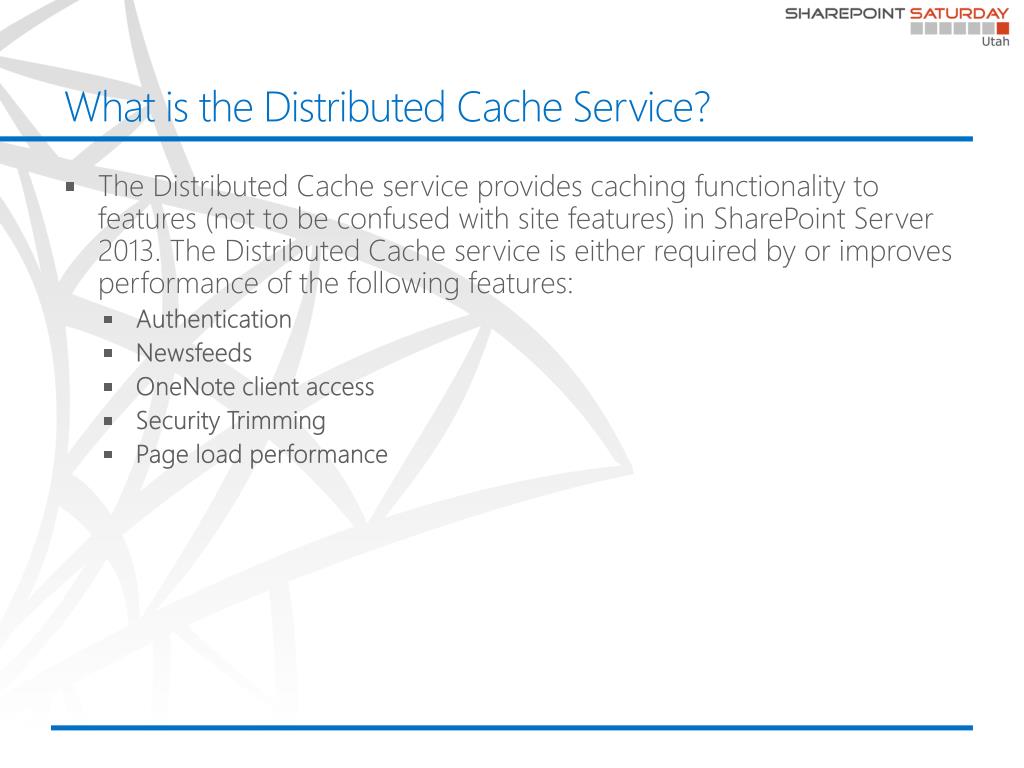Whatis the Distributed Cache Service? • The Distributed Cache service provides caching functionality to features (not to be confused with site features) in SharePoint Server 2013. The Distributed Cache service is either required by or improves performance of the following features: • Authentication • Newsfeeds • OneNote client access • Security Trimming • Page load performance
