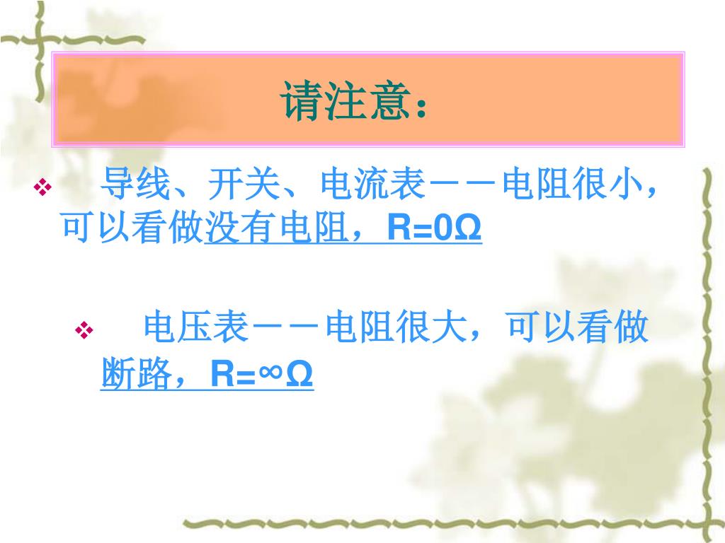 请注意: • 导线、开关、电流表--电阻很小,可以看做没有电阻,R=0Ω • 电压表--电阻很大,可以看做断路,R=∞Ω