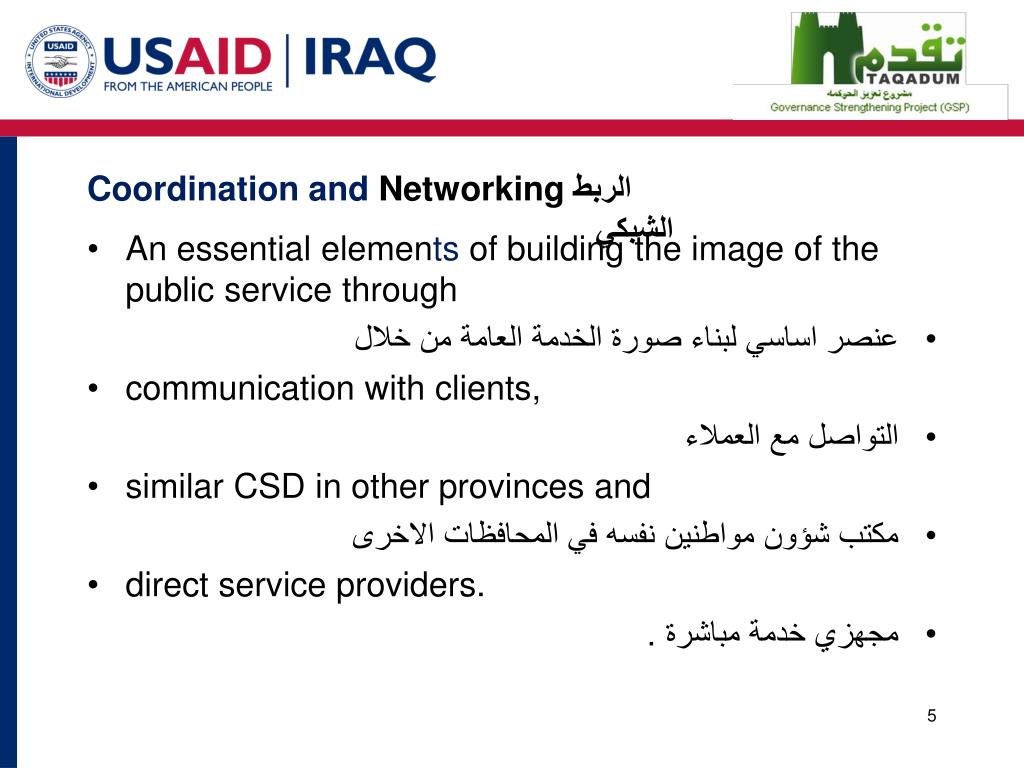 Coordination and Networkingالربط الشبكي • An essential elementsof building the image of the public service through • عنصر اساسي لبناء صورة الخدمة العامة من خلال • communication with clients, • التواصل مع العملاء • similar CSD in other provinces and • مكتب شؤون مواطنين نفسه في المحافظات الاخرى • direct service providers. • مجهزي خدمة مباشرة .