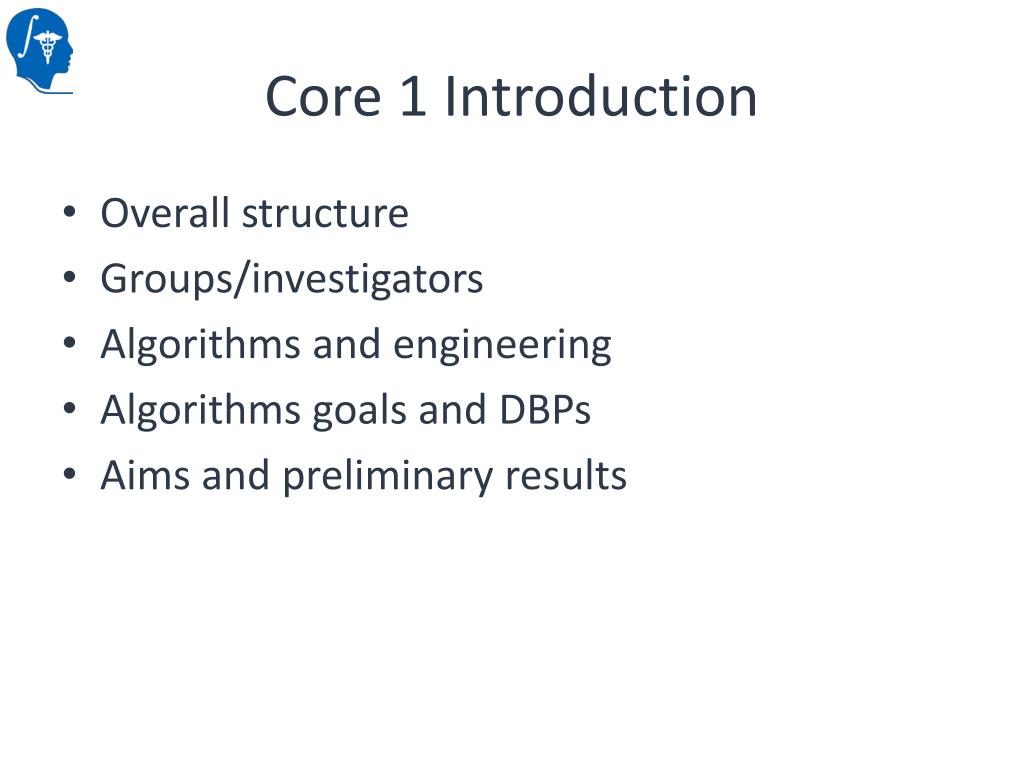 Core 1 Introduction • Overall structure • Groups/investigators • Algorithms and engineering • Algorithms goals and DBPs • Aims and preliminary results
