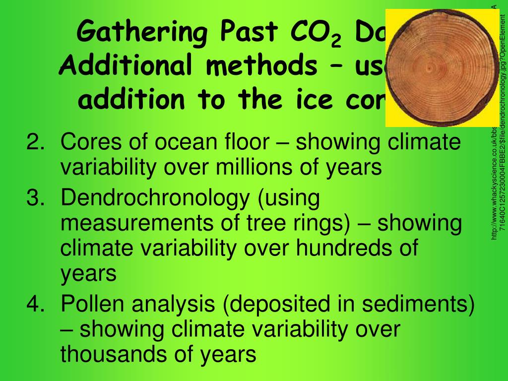 Gathering Past CO2 Data:Additional methods – used in addition to the ice cores: • Cores of ocean floor – showing climate variability over millions of years • Dendrochronology (using measurements of tree rings) – showing climate variability over hundreds of years • Pollen analysis (deposited in sediments) – showing climate variability over thousands of years http://www.whackyscience.co.uk/bbs/WScms/WScms.nsf/0/A0B10BA0CBA71640C1257230004FBBE2/$file/dendrochronology.jpg?OpenElement