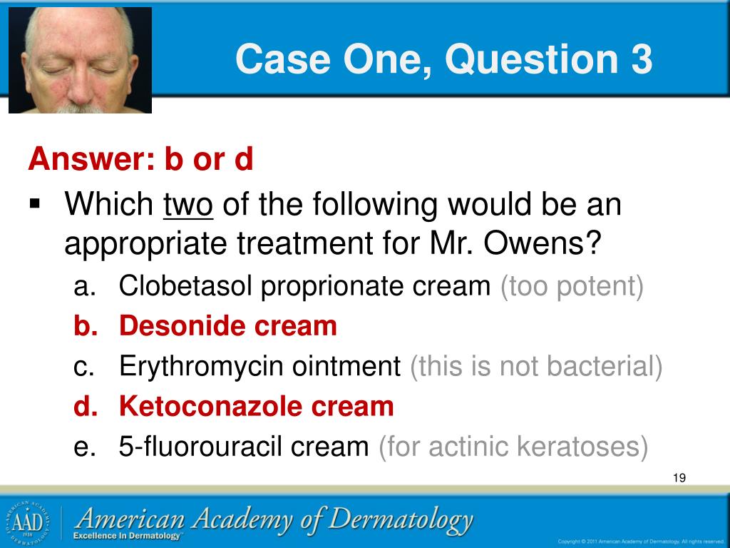Case One, Question 3 • Which two of the following would be an appropriate treatment for Mr. Owens? • Clobetasol proprionate cream • Desonide cream • Erythromycin ointment • Ketoconazole cream • 5-fluorouracil cream