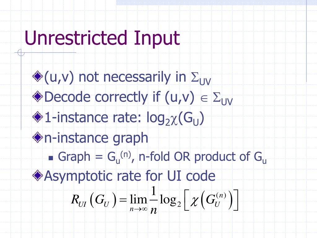 Unrestricted Input • (u,v) not necessarily in SUV • Decode correctly if (u,v) SUV • 1-instance rate: log2(GU) • n-instance graph • Graph = Gu(n), n-fold OR product of Gu • Asymptotic rate for UI code