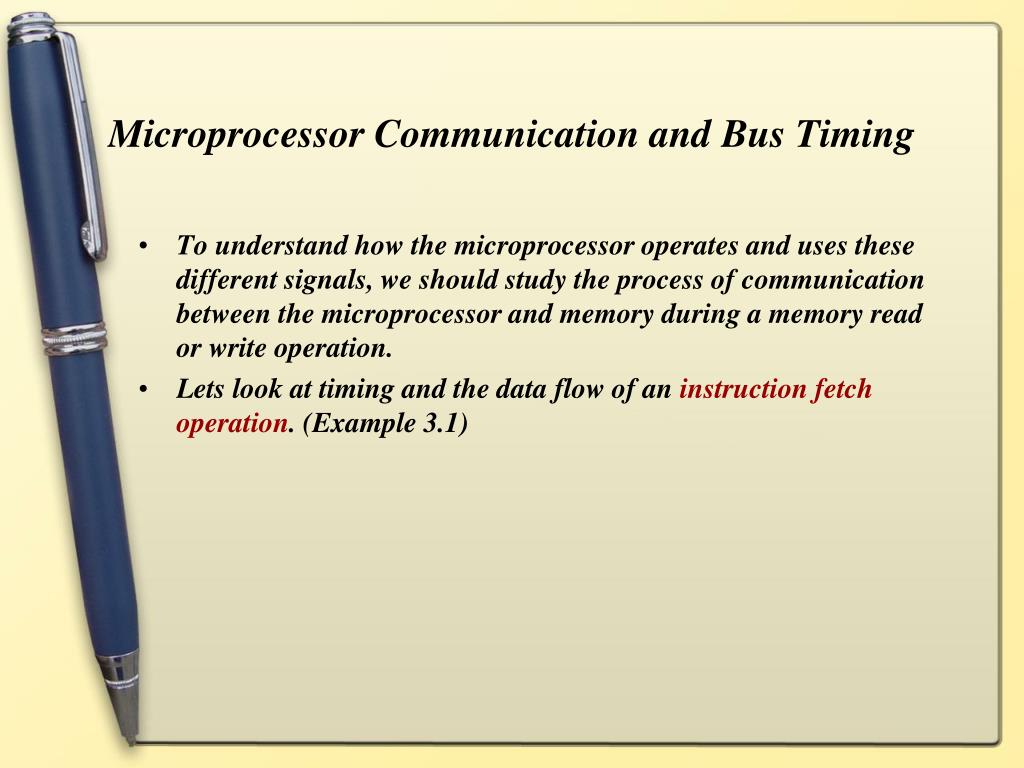 Microprocessor Communication and Bus Timing • To understand how the microprocessor operates and uses these different signals, we should study the process of communication between the microprocessor and memory during a memory read or write operation. • Lets look at timing and the data flow of an instruction fetch operation. (Example 3.1)