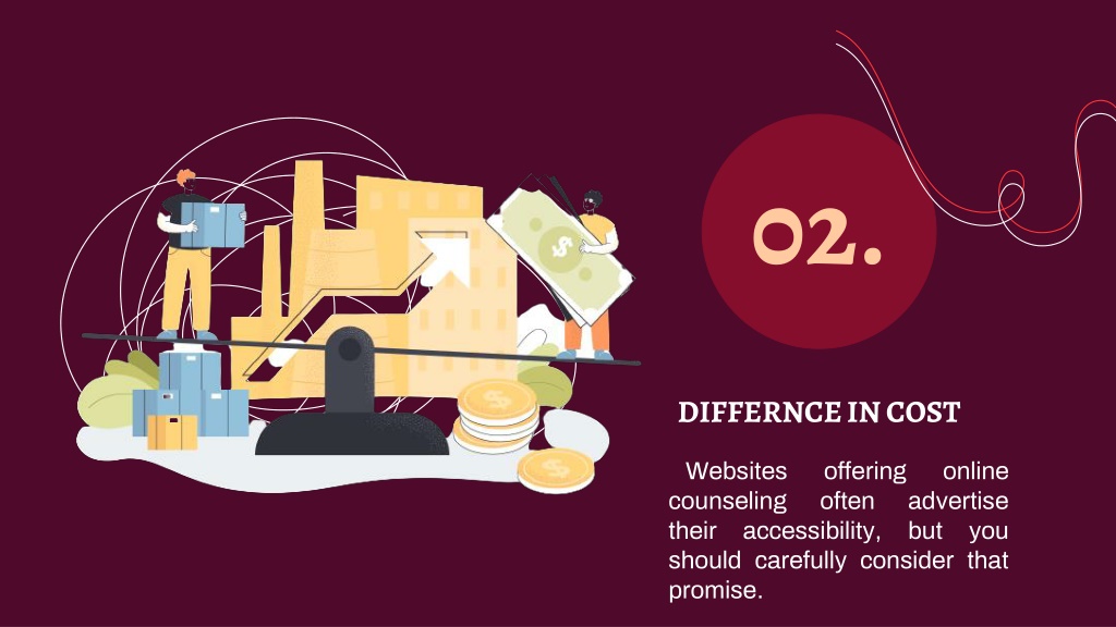 02. DIFFERNCE IN COST Websites offering online counseling often advertise their accessibility, but you should carefully consider that promise.