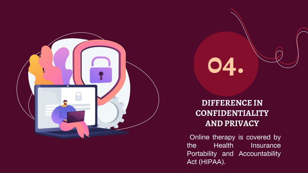 04. DIFFERENCE IN CONFIDENTIALITY AND PRIVACY Online therapy is covered by the Health Insurance Portability and Accountability Act (HIPAA).