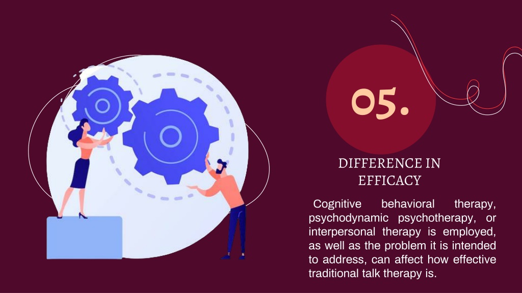 05. DIFFERENCE IN EFFICACY Cognitive behavioral therapy, psychodynamic psychotherapy, or interpersonal therapy is employed, as well as the problem it is intended to address, can affect how effective traditional talk therapy is.