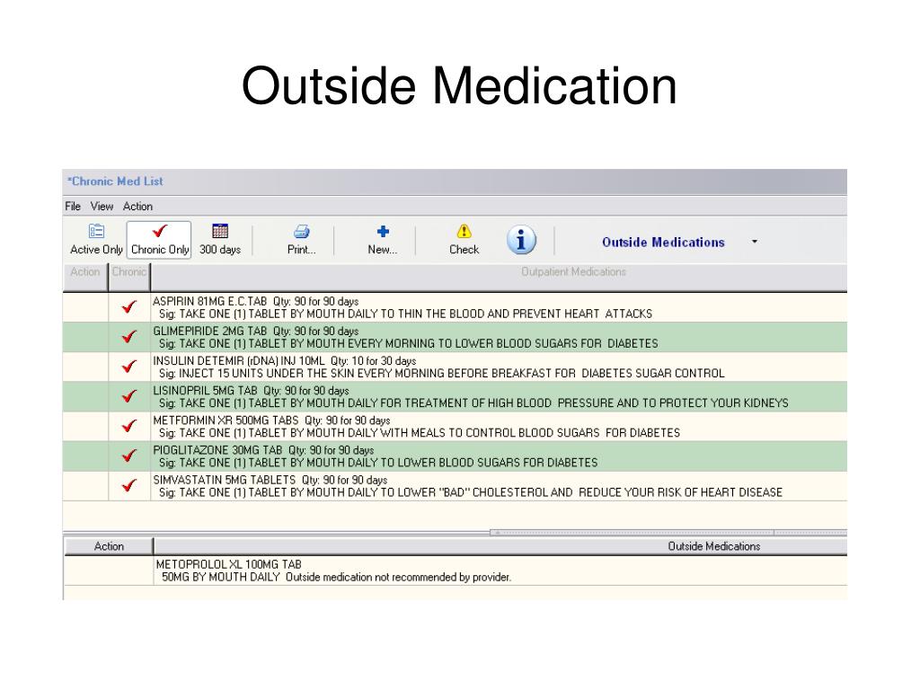 Outside Medication • It is a Med Rec Measure • End-user documents in EHR • Facilitates with communication • Medical Provider/Nurse driven • No executable for RPh to finish order • Each Meds need to be defined in PDM
