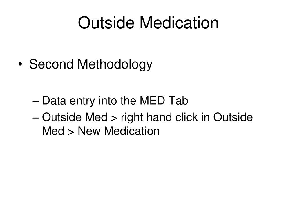 Outside Medication • Second Methodology • Data entry into the MED Tab • Outside Med > right hand click in Outside Med > New Medication
