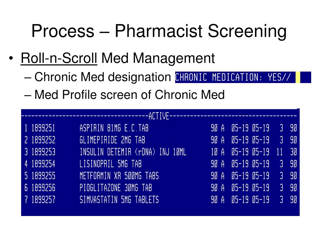 Process – Pharmacist Screening • Roll-n-Scroll Med Management • Chronic Med designation • Med Profile screen of Chronic Med