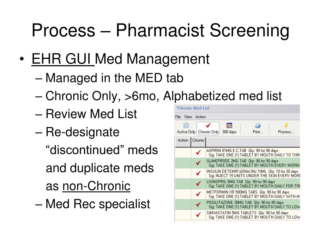 Process – Pharmacist Screening • EHR GUI Med Management • Managed in the MED tab • Chronic Only, >6mo, Alphabetized med list • Review Med List • Re-designate “discontinued” meds and duplicate meds as non-Chronic • Med Rec specialist