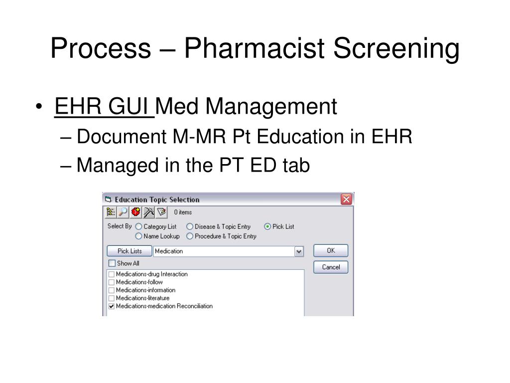 Process – Pharmacist Screening • EHR GUI Med Management • Document M-MR Pt Education in EHR • Managed in the PT ED tab