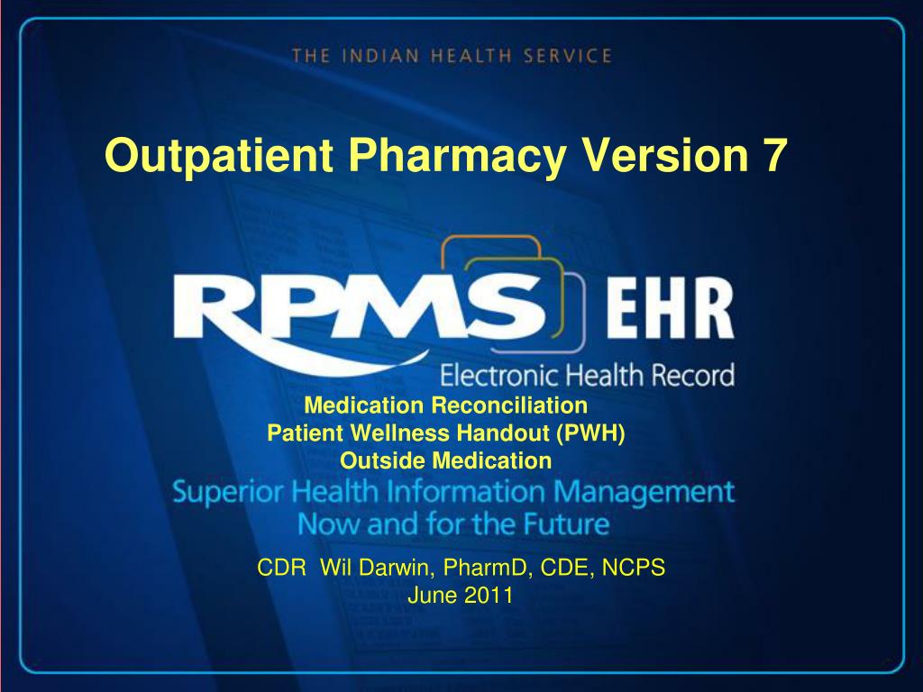 Outpatient Pharmacy Version 7Medication ReconciliationPatient Wellness Handout (PWH) Outside Medication CDR Wil Darwin, PharmD, CDE, NCPS June 2011