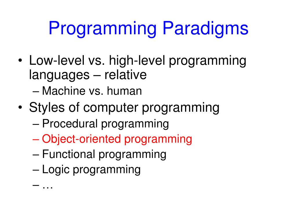 Programming Paradigms • Low-level vs. high-level programming languages – relative • Machine vs. human • Styles of computer programming • Procedural programming • Object-oriented programming • Functional programming • Logic programming • …