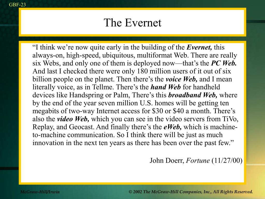 The Evernet • “I think we’re now quite early in the building of the Evernet, this always-on, high-speed, ubiquitous, multiformat Web. There are really six Webs, and only one of them is deployed now—that’s the PC Web. And last I checked there were only 180 million users of it out of six billion people on the planet. Then there’s the voice Web, and I mean literally voice, as in Tellme. There’s the hand Web for handheld devices like Handspring or Palm, There’s this broadband Web, where by the end of the year seven million U.S. homes will be getting ten megabits of two-way Internet access for $30 or $40 a month. There’s also the video Web, which you can see in the video servers from TiVo, Replay, and Geocast. And finally there’s the eWeb, which is machine-to-machine communication. So I think there will be just as much innovationin the next ten years as there has been over the past few.” • John Doerr, Fortune (11/27/00)