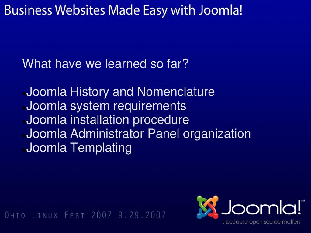 What have we learned so far? Joomla History and Nomenclature Joomla system requirements Joomla installation procedure Joomla Administrator Panel organization Joomla Templating