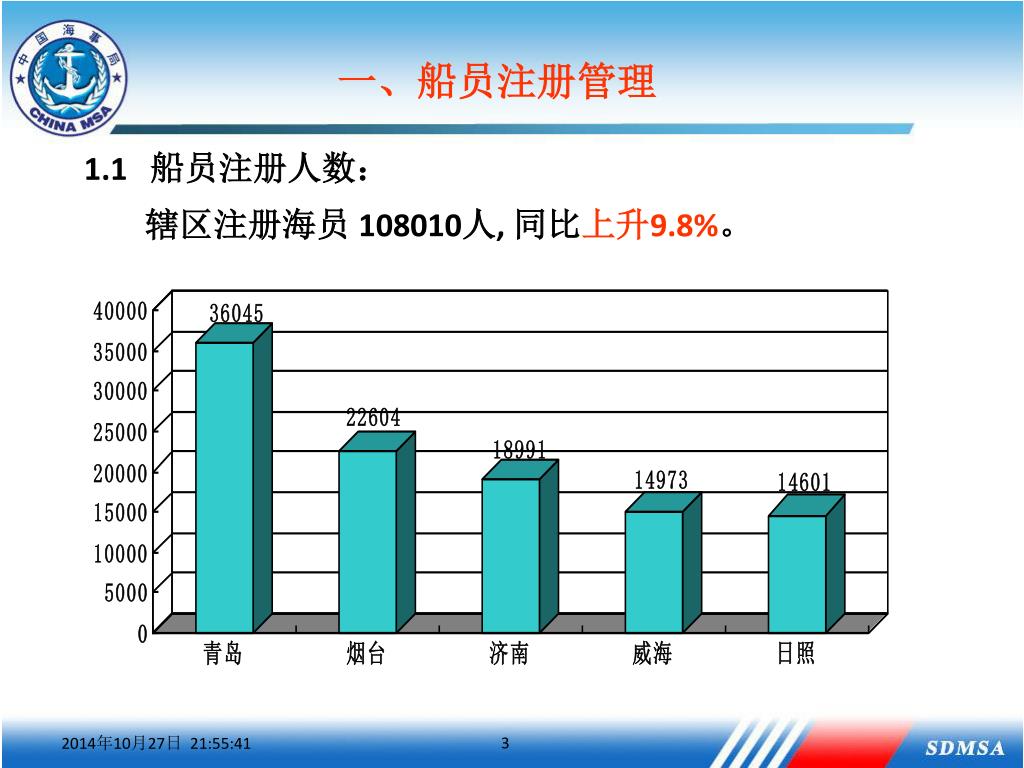 一、船员注册管理 1.1 船员注册人数: 辖区注册海员 108010人, 同比上升9.8%。 2014年10月27日21:55:41 3