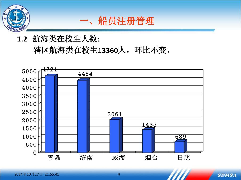 2014 年 6 月份 船员管理形势分析报告. 船 员 管 理 处 2014 年 6 月 28 日. 2014 年 6 月份船员管理形势分析报告. 一、船员注册管理 二、船员考试发证 三、船员动态监管 四、船员权益维护. 2014年10月27日 21:55:41. 2. 一、船员注册管理. 1.1 船员注册人数:. 辖区注册海员 108010 人 , 同比 上升 9.8% 。. 2014年10月27日 21:55:41. 3. 一、船员注册管理. 1.2 航海类在校生人数 : 辖区航海类在校生 13360 人,环比不变。.