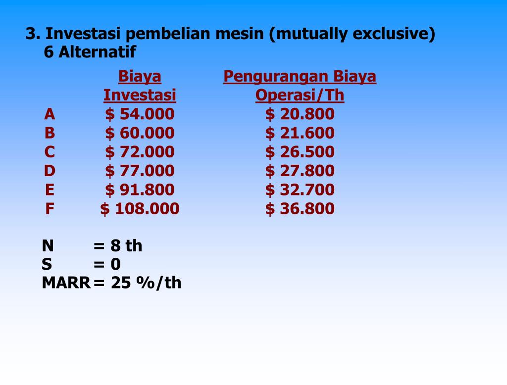 3. Investasi pembelian mesin (mutually exclusive) 6 Alternatif N = 8 th S = 0 MARR = 25 %/th