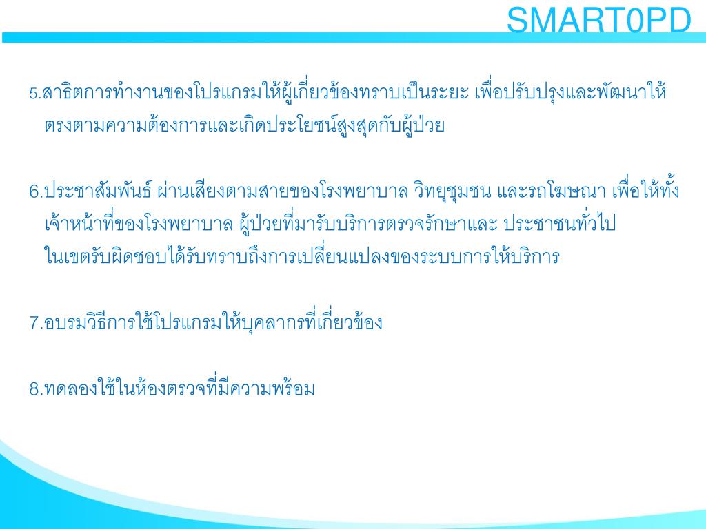 SMART0PD 5.สาธิตการทำงานของโปรแกรมให้ผู้เกี่ยวข้องทราบเป็นระยะ เพื่อปรับปรุงและพัฒนาให้ ตรงตามความต้องการและเกิดประโยชน์สูงสุดกับผู้ป่วย 6.ประชาสัมพันธ์ ผ่านเสียงตามสายของโรงพยาบาล วิทยุชุมชน และรถโฆษณา เพื่อให้ทั้ง เจ้าหน้าที่ของโรงพยาบาล ผู้ป่วยที่มารับบริการตรวจรักษาและ ประชาชนทั่วไป ในเขตรับผิดชอบได้รับทราบถึงการเปลี่ยนแปลงของระบบการให้บริการ 7.อบรมวิธีการใช้โปรแกรมให้บุคลากรที่เกี่ยวข้อง 8.ทดลองใช้ในห้องตรวจที่มีความพร้อม