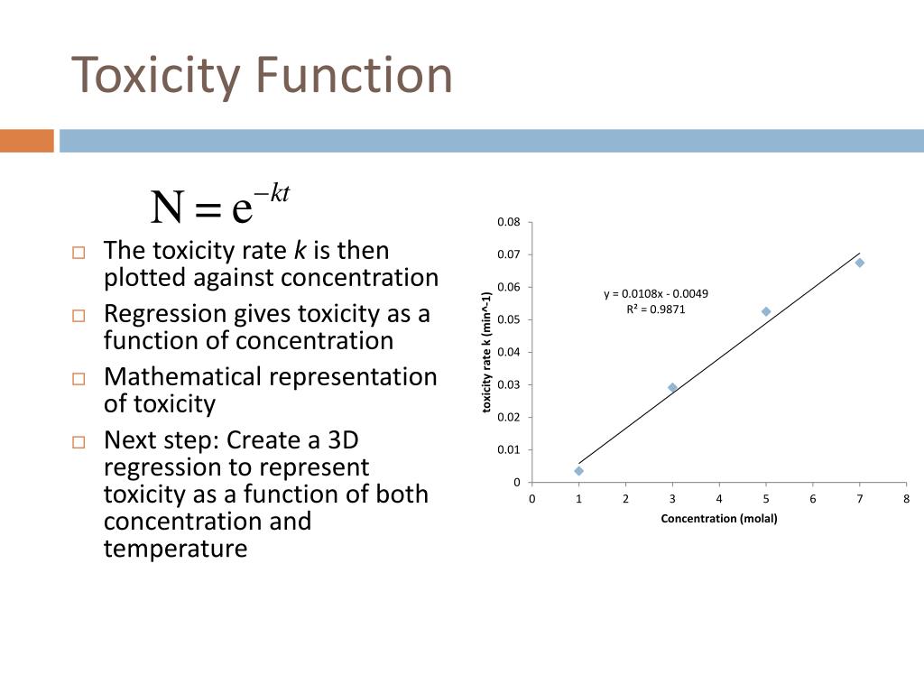 Toxicity Function • The toxicity rate k is then plotted against concentration • Regression gives toxicity as a function of concentration • Mathematical representation of toxicity • Next step: Create a 3D regression to represent toxicity as a function of both concentration and temperature