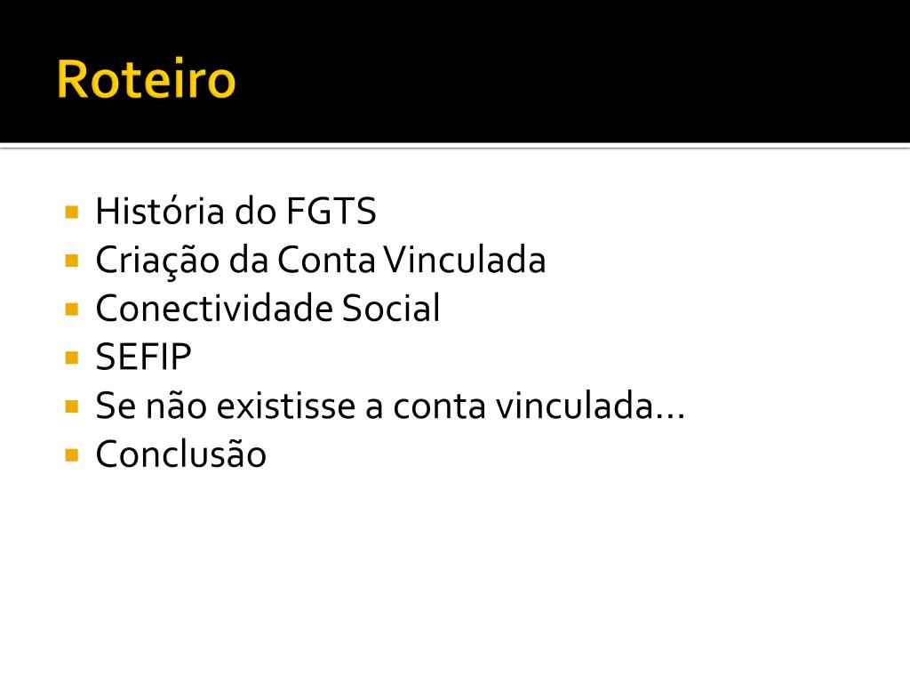 Roteiro • História do FGTS • Criação da Conta Vinculada • Conectividade Social • SEFIP • Se não existisse a conta vinculada... • Conclusão