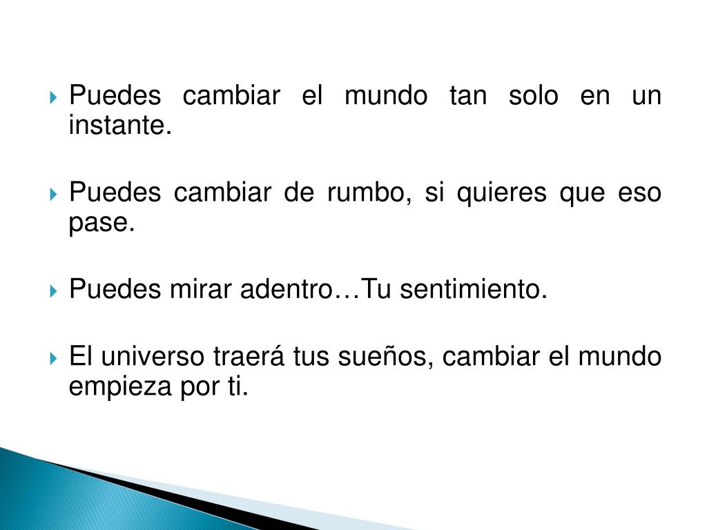 Puedes cambiar el mundo tan solo en un instante. • Puedes cambiar de rumbo, si quieres que eso pase. • Puedes mirar adentro…Tu sentimiento. • El universo traerá tus sueños, cambiar el mundo empieza por ti.