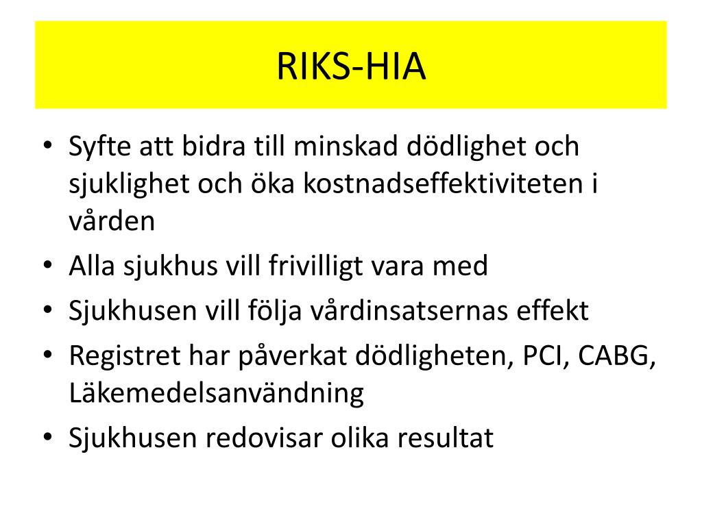 RIKS-HIA • Syfte att bidra till minskad dödlighet och sjuklighet och öka kostnadseffektiviteten i vården • Alla sjukhus vill frivilligt vara med • Sjukhusen vill följa vårdinsatsernas effekt • Registret har påverkat dödligheten, PCI, CABG, Läkemedelsanvändning • Sjukhusen redovisar olika resultat