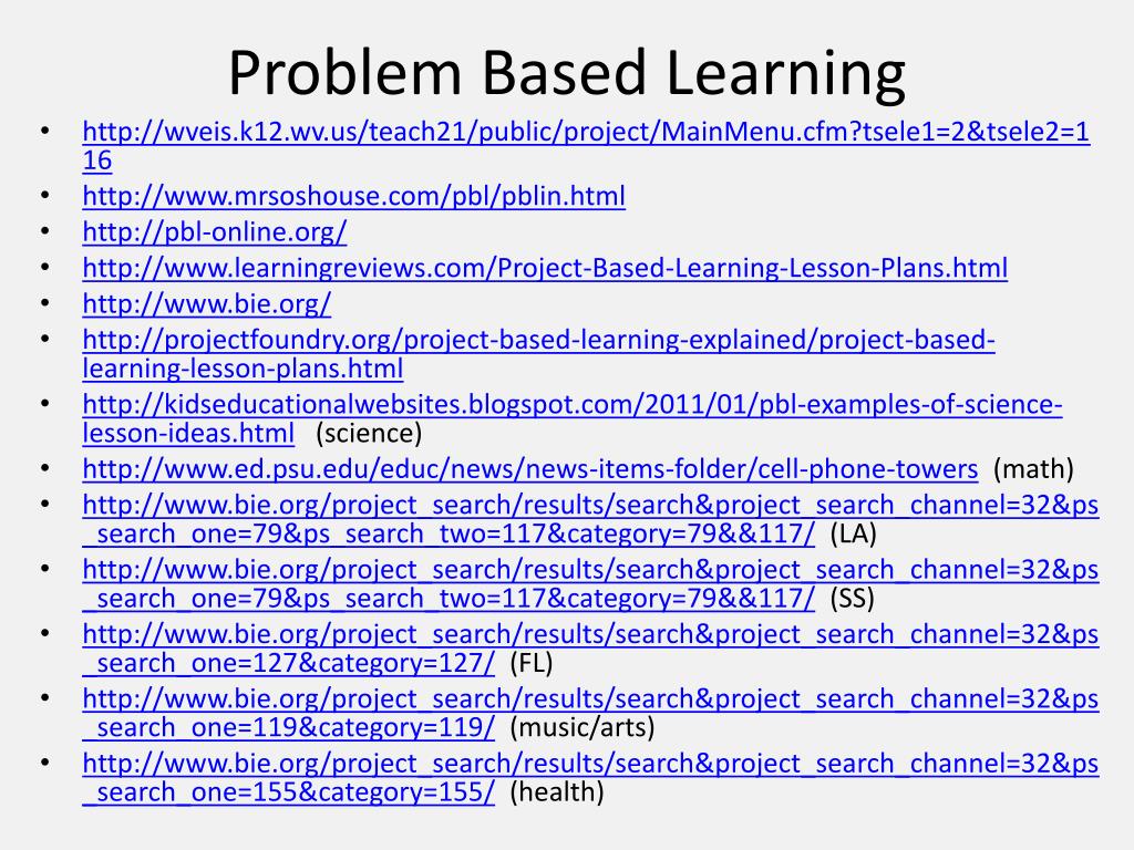 Problem Based Learning • http://wveis.k12.wv.us/teach21/public/project/MainMenu.cfm?tsele1=2&tsele2=116 • http://www.mrsoshouse.com/pbl/pblin.html • http://pbl-online.org/ • http://www.learningreviews.com/Project-Based-Learning-Lesson-Plans.html • http://www.bie.org/ • http://projectfoundry.org/project-based-learning-explained/project-based-learning-lesson-plans.html • http://kidseducationalwebsites.blogspot.com/2011/01/pbl-examples-of-science-lesson-ideas.html (science) • http://www.ed.psu.edu/educ/news/news-items-folder/cell-phone-towers (math) • http://www.bie.org/project_search/results/search&project_search_channel=32&ps_search_one=79&ps_search_two=117&category=79&&117/ (LA) • http://www.bie.org/project_search/results/search&project_search_channel=32&ps_search_one=79&ps_search_two=117&category=79&&117/ (SS) • http://www.bie.org/project_search/results/search&project_search_channel=32&ps_search_one=127&category=127/ (FL) • http://www.bie.org/project_search/results/search&project_search_channel=32&ps_search_one=119&category=119/ (music/arts) • http://www.bie.org/project_search/results/search&project_search_channel=32&ps_search_one=155&category=155/ (health)