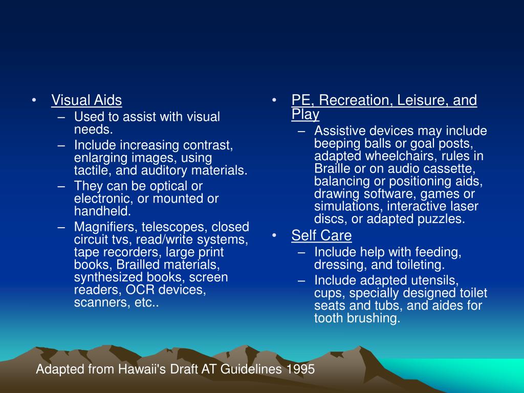 Visual Aids Used to assist with visual needs. Include increasing contrast, enlarging images, using tactile, and auditory materials. They can be optical or electronic, or mounted or handheld. Magnifiers, telescopes, closed circuit tvs, read/write systems, tape recorders, large print books, Brailled materials, synthesized books, screen readers, OCR devices, scanners, etc.. PE, Recreation, Leisure, and Play Assistive devices may include beeping balls or goal posts, adapted wheelchairs, rules in Braille or on audio cassette, balancing or positioning aids, drawing software, games or simulations, interactive laser discs, or adapted puzzles. Self Care Include help with feeding, dressing, and toileting. Include adapted utensils, cups, specially designed toilet seats and tubs, and aides for tooth brushing. Adapted from Hawaii's Draft AT Guidelines 1995