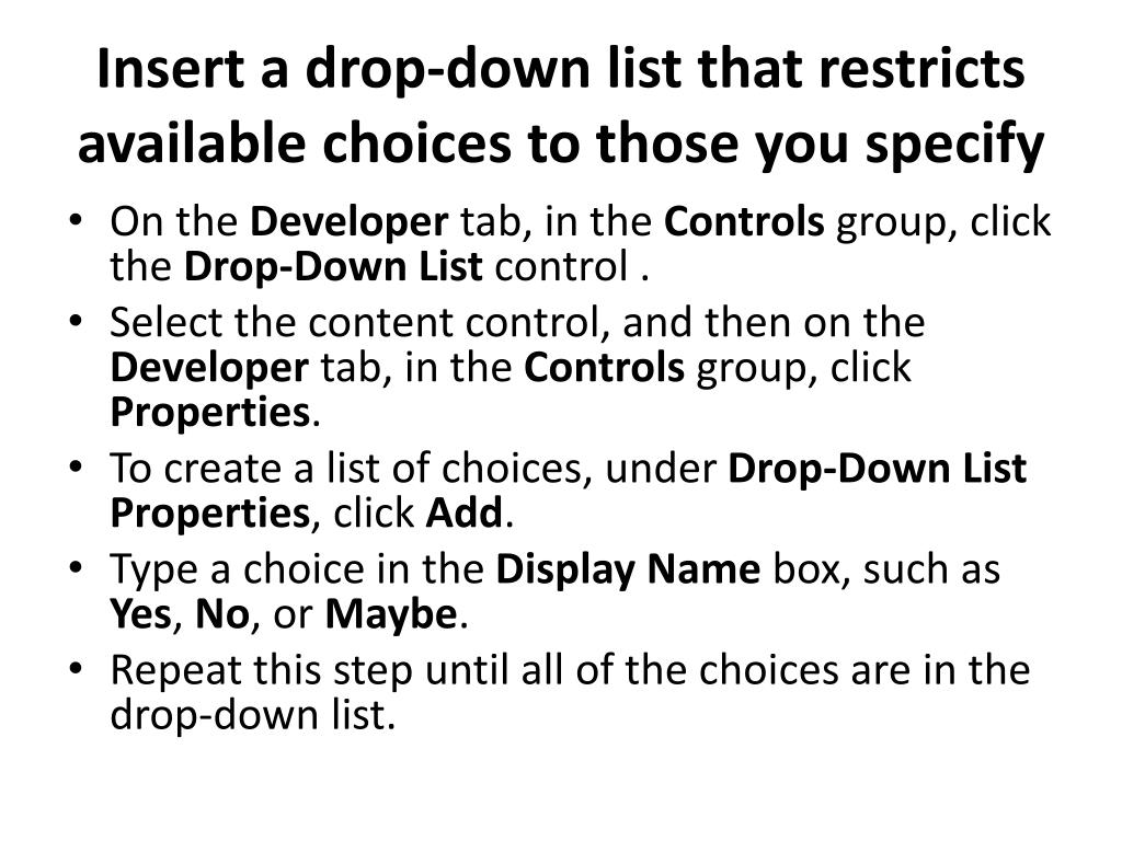 Insert a drop-down list that restricts available choices to those you specify • On the Developer tab, in the Controls group, click the Drop-Down List control . • Select the content control, and then on the Developer tab, in the Controls group, click Properties. • To create a list of choices, under Drop-Down List Properties, click Add. • Type a choice in the Display Name box, such as Yes, No, or Maybe. • Repeat this step until all of the choices are in the drop-down list.