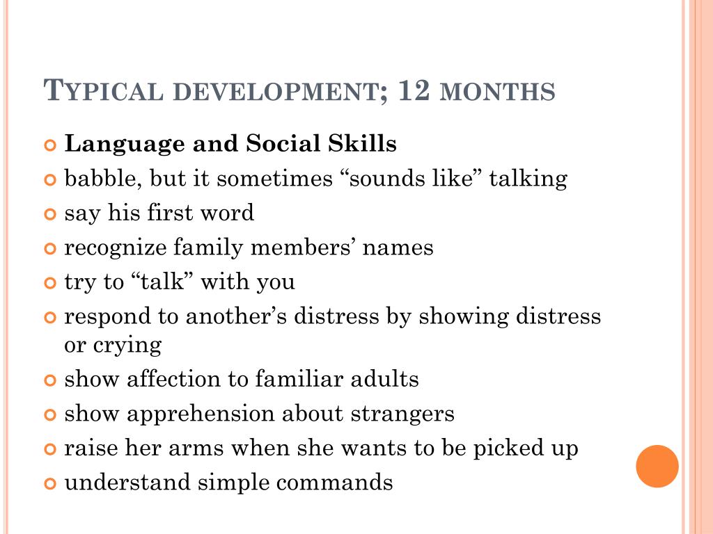 Typical development; 12 months • Language and Social Skills • babble, but it sometimes “sounds like” talking • say his first word • recognize family members’ names • try to “talk” with you • respond to another’s distress by showing distress or crying • show affection to familiar adults • show apprehension about strangers • raise her arms when she wants to be picked up • understand simple commands