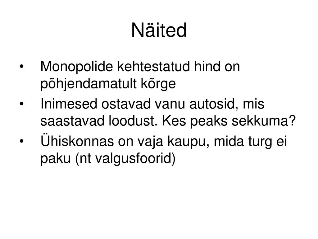 Näited • Monopolide kehtestatud hind on põhjendamatult kõrge • Inimesed ostavad vanu autosid, mis saastavad loodust. Kes peaks sekkuma? • Ühiskonnas on vaja kaupu, mida turg ei paku (nt valgusfoorid)