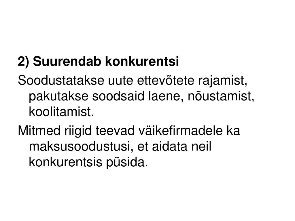 2) Suurendab konkurentsi Soodustatakse uute ettevõtete rajamist, pakutakse soodsaid laene, nõustamist, koolitamist. Mitmed riigid teevad väikefirmadele ka maksusoodustusi, et aidata neil konkurentsis püsida.