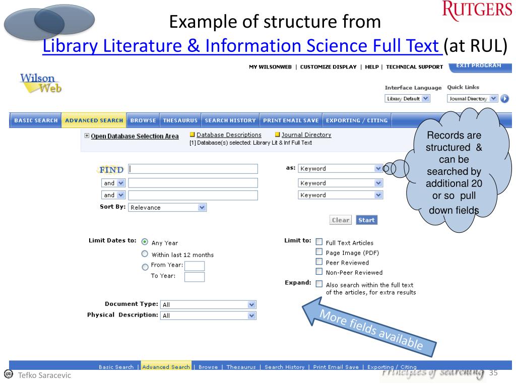 Example of structure fromLibrary Literature & Information Science Full Text (at RUL) Records are structured & can be searched by additional 20 or so pull down fields More fields available © Tefko Saracevic