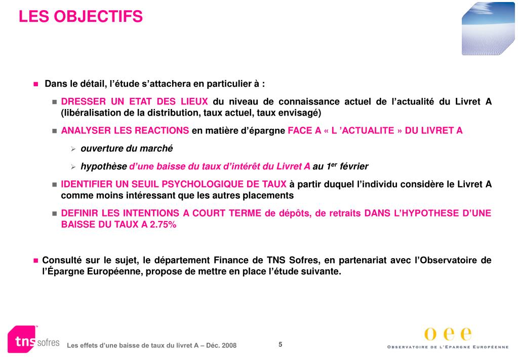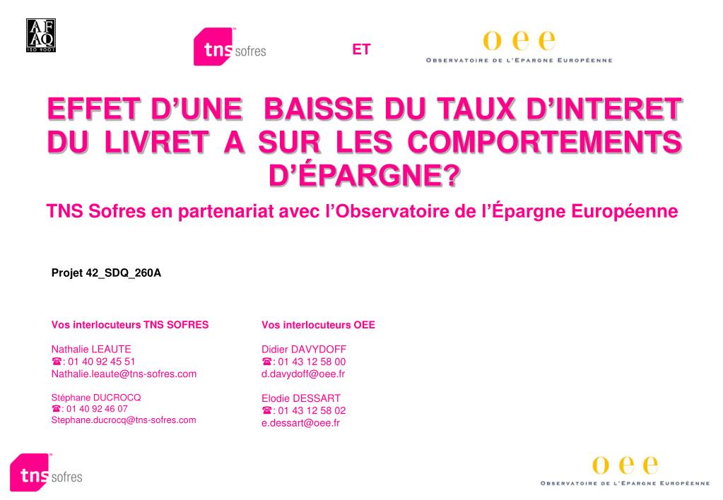 ET EFFET D’UNE BAISSE DU TAUX D’INTERET DU LIVRET A SUR LES COMPORTEMENTS D’ÉPARGNE?TNS Sofres en partenariat avec l’Observatoire de l’Épargne Européenne Projet 42_SDQ_260A Vos interlocuteurs TNS SOFRES Nathalie LEAUTE : 01 40 92 45 51 Nathalie.leaute@tns-sofres.com Stéphane DUCROCQ : 01 40 92 46 07 Stephane.ducrocq@tns-sofres.com Vos interlocuteurs OEE Didier DAVYDOFF : 01 43 12 58 00 d.davydoff@oee.fr Elodie DESSART : 01 43 12 58 02 e.dessart@oee.fr