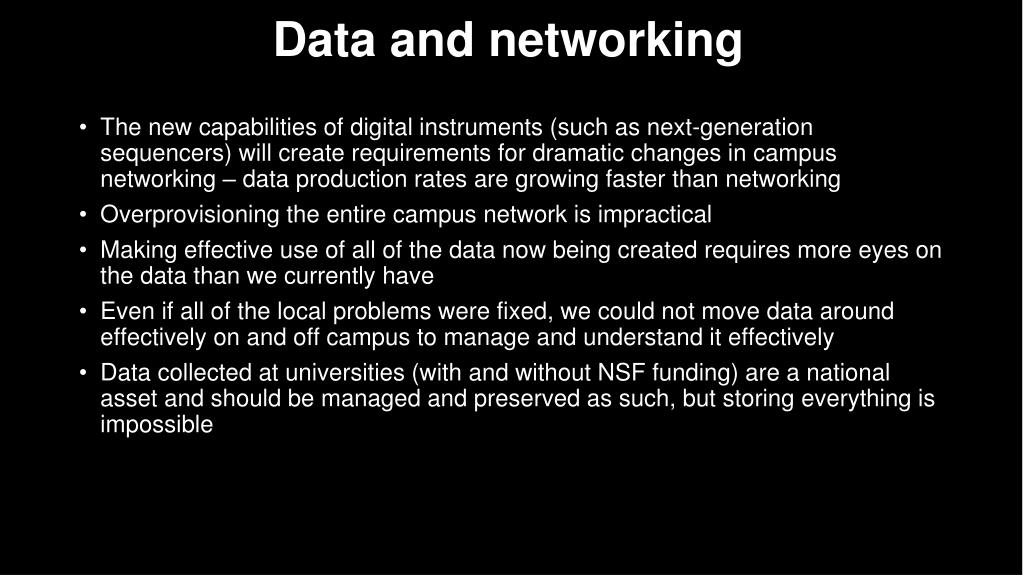 Data and networking • The new capabilities of digital instruments (such as next-generation sequencers) will create requirements for dramatic changes in campus networking – data production rates are growing faster than networking • Overprovisioning the entire campus network is impractical • Making effective use of all of the data now being created requires more eyes on the data than we currently have • Even if all of the local problems were fixed, we could not move data around effectively on and off campus to manage and understand it effectively • Data collected at universities (with and without NSF funding) are a national asset and should be managed and preserved as such, but storing everything is impossible