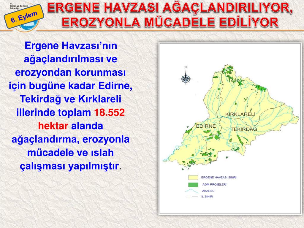 ERGENE HAVZASI AĞAÇLANDIRILIYOR, EROZYONLA MÜCADELE EDİLİYOR 6. Eylem • ErgeneHavzası’nınağaçlandırılmasıveerozyondankorunmasıiçinbugünekadar Edirne, TekirdağveKırklareliillerindetoplam18.552hektaralandaağaçlandırma, erozyonlamücadeleveıslahçalışmasıyapılmıştır.