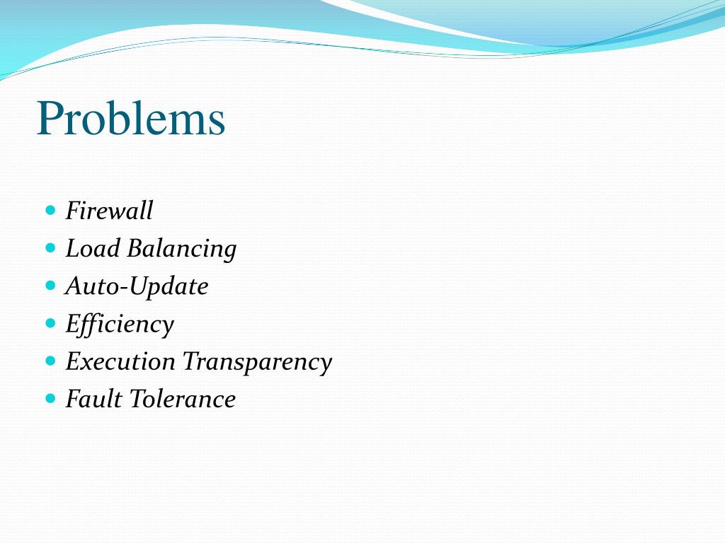 Problems • Firewall • Load Balancing • Auto-Update • Efficiency • Execution Transparency • Fault Tolerance