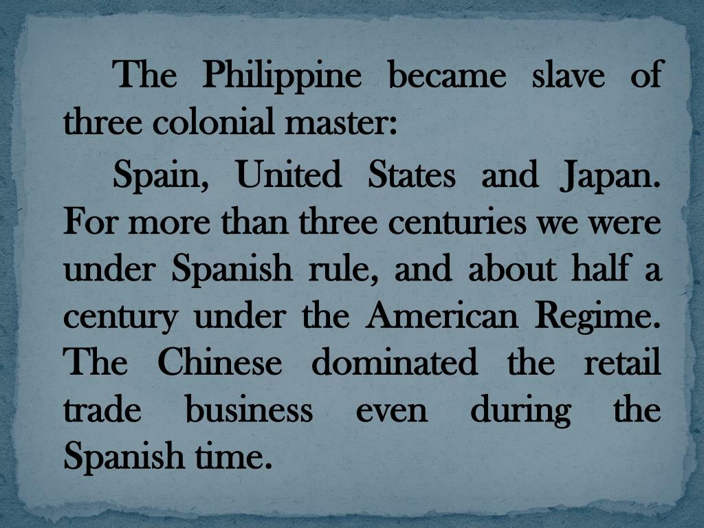The Philippine became slave of three colonial master: Spain, United States and Japan. For more than three centuries we were under Spanish rule, and about half a century under the American Regime. The Chinese dominated the retail trade business even during the Spanish time.