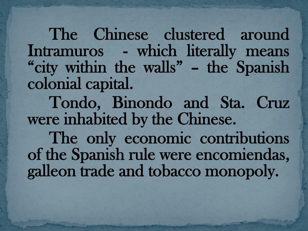 The Chinese clustered around Intramuros - which literally means “city within the walls” – the Spanish colonial capital. Tondo, Binondo and Sta. Cruz were inhabited by the Chinese. The only economic contributions of the Spanish rule were encomiendas, galleon trade and tobacco monopoly.