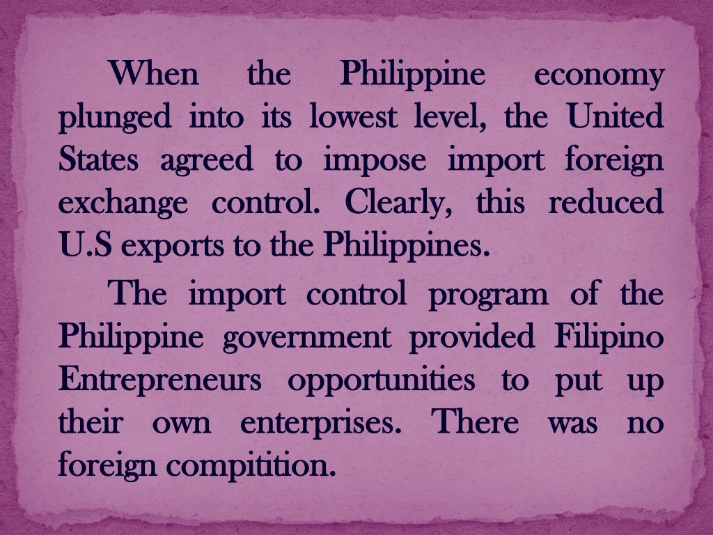 When the Philippine economy plunged into its lowest level, the United States agreed to impose import foreign exchange control. Clearly, this reduced U.S exports to the Philippines. The import control program of the Philippine government provided Filipino Entrepreneurs opportunities to put up their own enterprises. There was no foreign compitition.